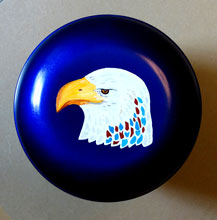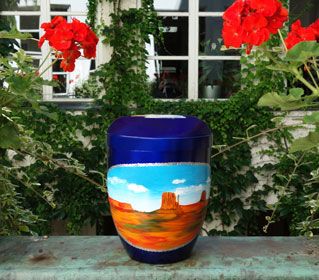 Monument Valley with bald eagle head (Acrylic painting on biodegradable urn)
