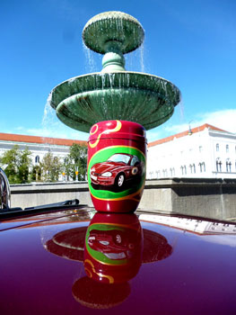 The blue sky is reflected in the wine-red convertible paintwork and "colors" it purple!