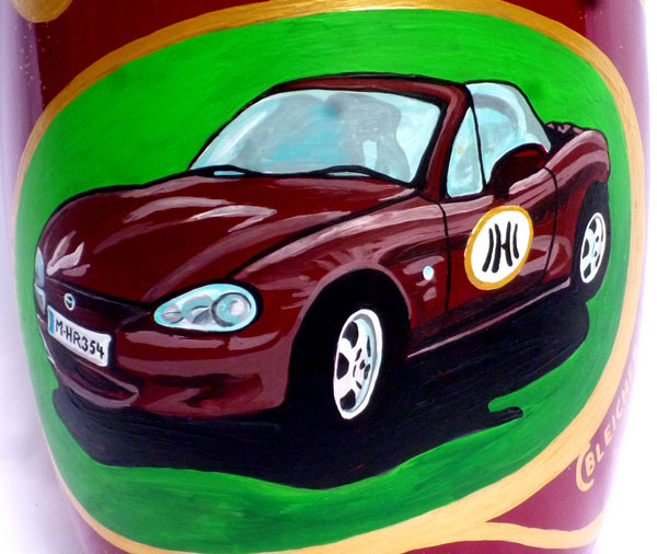 Painting of metal urn in bordeaux red (or similar color), front side with Heras convertible